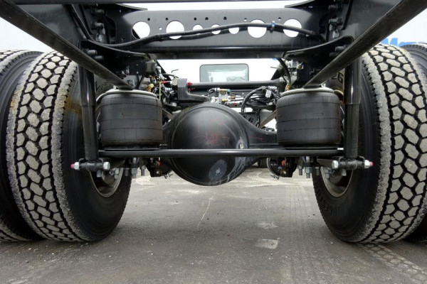 Комплексний огляд на підйомнику для вантажівок, перевірка зносу пружин, стійок, опорних підшипників, тестування люфтів і геометрії.